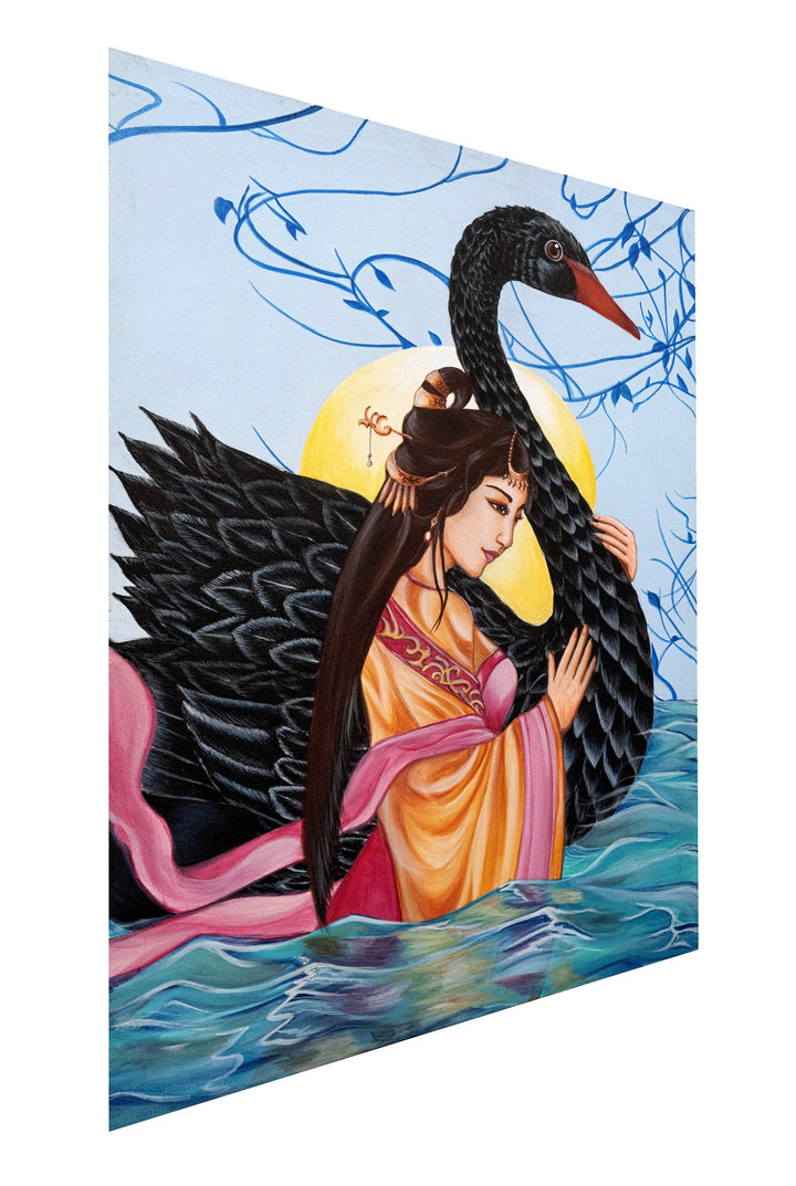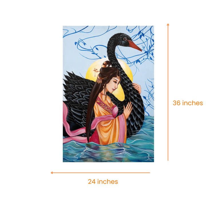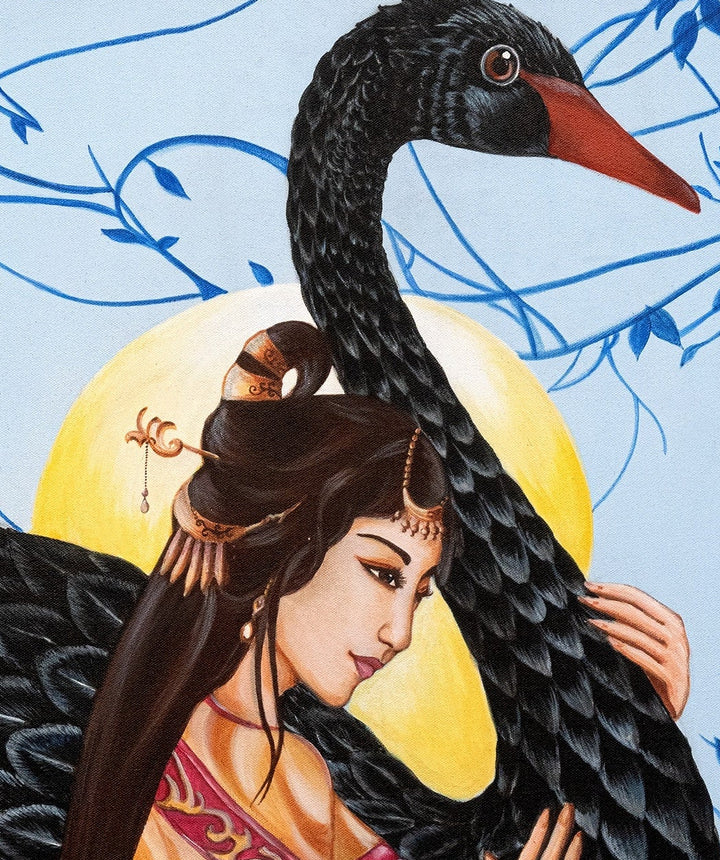 For my first series of canvas paintings I have worked on oriental themes, a concept that had captured my interest in eastern culture through the internet. In this painting I've portrayed women along with animal to show the combination of beauty and power. Here, an Asian historic character is portrayed embracing a famous mythical creature i.e. a Black Swan. The female is the personification of a conscious self while a swan is a symbolic representation of the unforeseen.