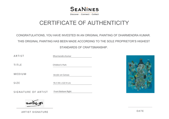 Dharmendra Kumar, his paintings are a strong combination of the mutual relationship between humans, animals, and nature. In his paintings, the animal form can be seen as an extension of nature within humans. The incorporation of animals, birds, flower leaves shapes in the paintings which they make enhances their natural relationships. Looking at the paintings, it seems that while creating their natural beauty, they are creating a new creation. The lines in their paintings are different from the actual sizes.