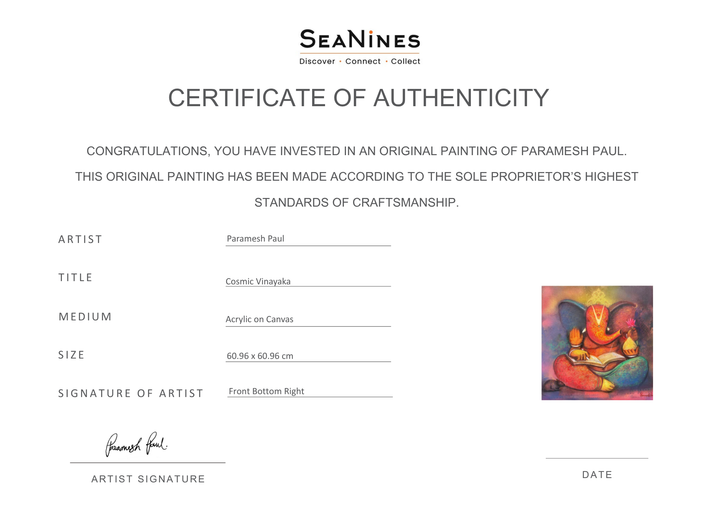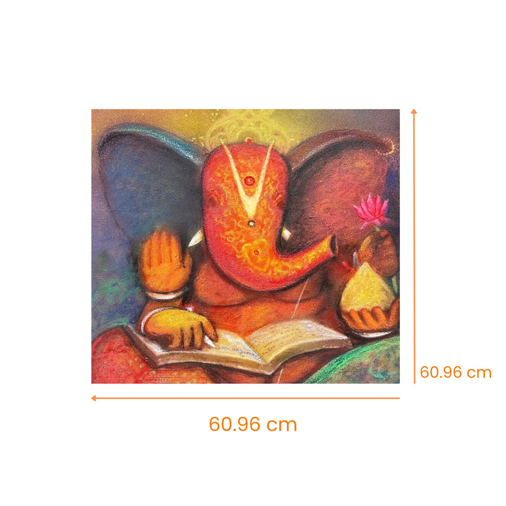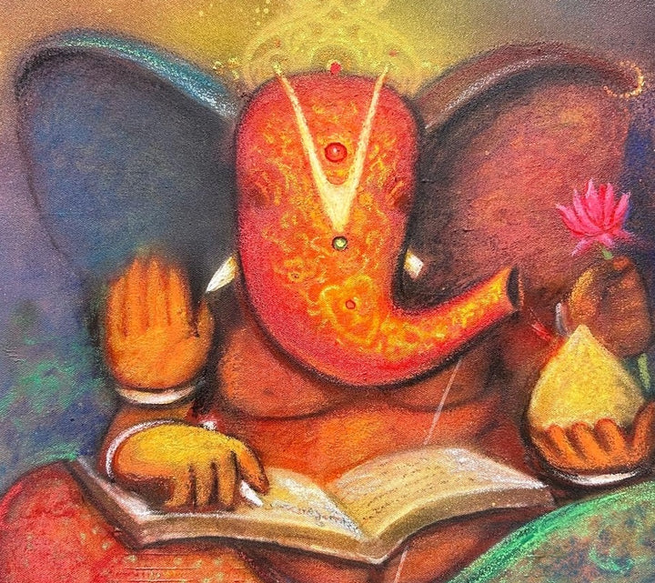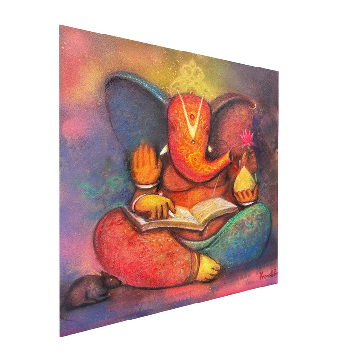 In this celestial depiction, “Cosmic Vinayaka” is immersed in divine knowledge. Ganesha is shown reading scriptures, holding a lotus and a modak, symbolizing wisdom, purity, and fulfillment. The vibrant interplay of glowing reds, cosmic purples, and divine yellows reflects the vastness of the universe and his role as the Lord of Beginnings. The luminous aura behind him echoes the divine halo, while the gentle mouse looks on, reinforcing humility in the grand cosmic order.