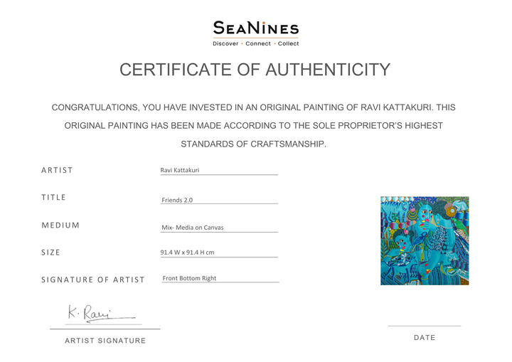 Ravi Envelops three women in varying shades of blue, fostering an intimate atmosphere amidst a lively backdrop of animals like tigers, rabbits, parrots, and a dog, alongside floral and heart motifs. The close physical proximity and shared glances between the women convey a strong sense of camaraderie and emotional connection. Through this vibrant and symbolic composition, Ravi explores the beauty of female bonds and the depth of their shared feelings within his distinct artistic vision.