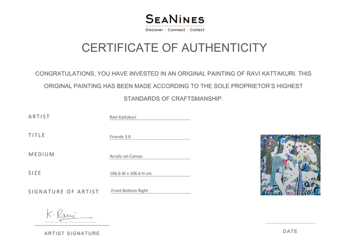 Ravi presents four women gathered closely, their expressions suggesting a shared intimacy and gentle connection. The women are surrounded by stylized animals like rabbits and a bird perched delicately on a hand, set against an intricate backdrop of floral and abstract patterns. Through this composition, rich in detail and a vibrant colour palette, Ravi explores the beauty of female companionship and the subtle nuances of their emotional world, consistent with his artistic focus.