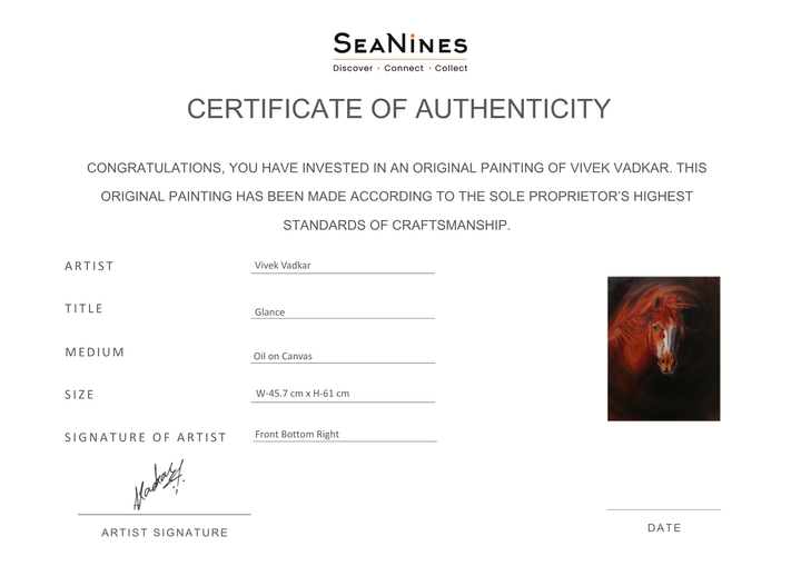 "Glance" presents a close-up portrait of a horse emerging from a dark background, evoking a sense of intimacy and contemplation. The horse's gaze invites reflection, hinting at its thoughts and emotions. Despite the serene atmosphere, its posture and expression convey quiet strength and dignity.