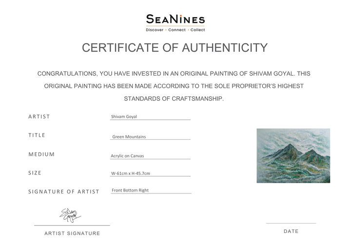 Shivam Goyal, paints mountains with acrylics to explore their sacred silence, majesty, and mystery. For him, these ancient sentinels hold stories of stillness, storms, and spiritual awakening. Through bold layers of color, texture, and light, he evokes the emotional depth hidden within each peak.