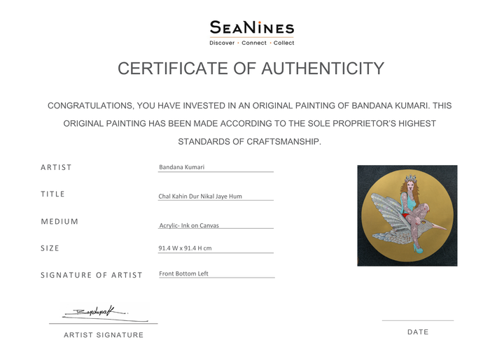 Bandana Kumari, her artwork present a depiction of different aspects of female with body of human and face of lioness. The body is covered with flowers, butterfly, fish grapes and more which represent the delicacy & softness of female on the other hand, her lioness head represent her strength and courage.