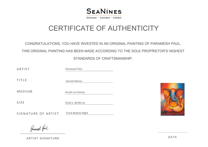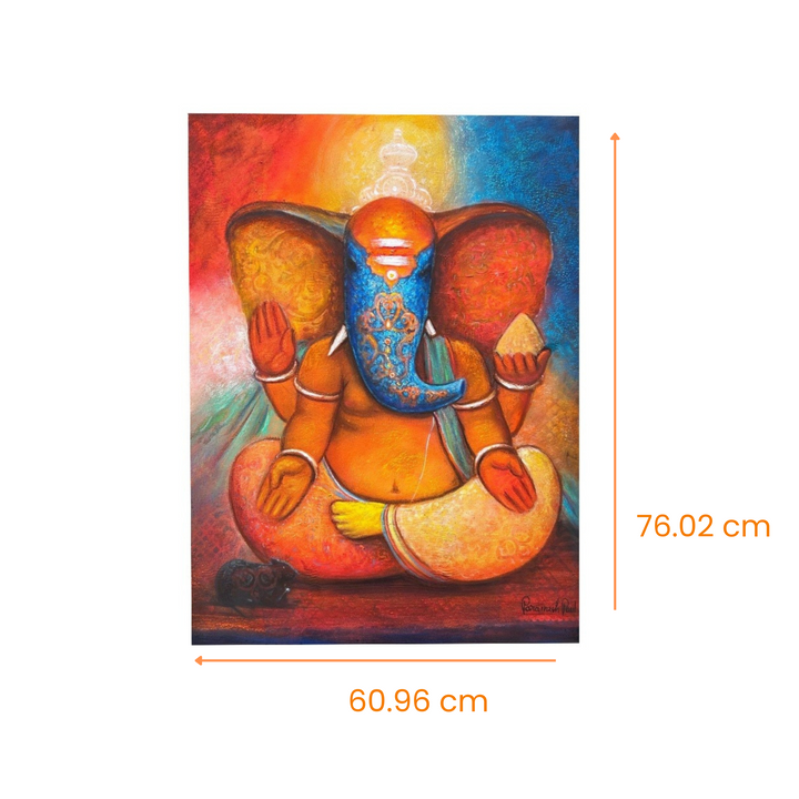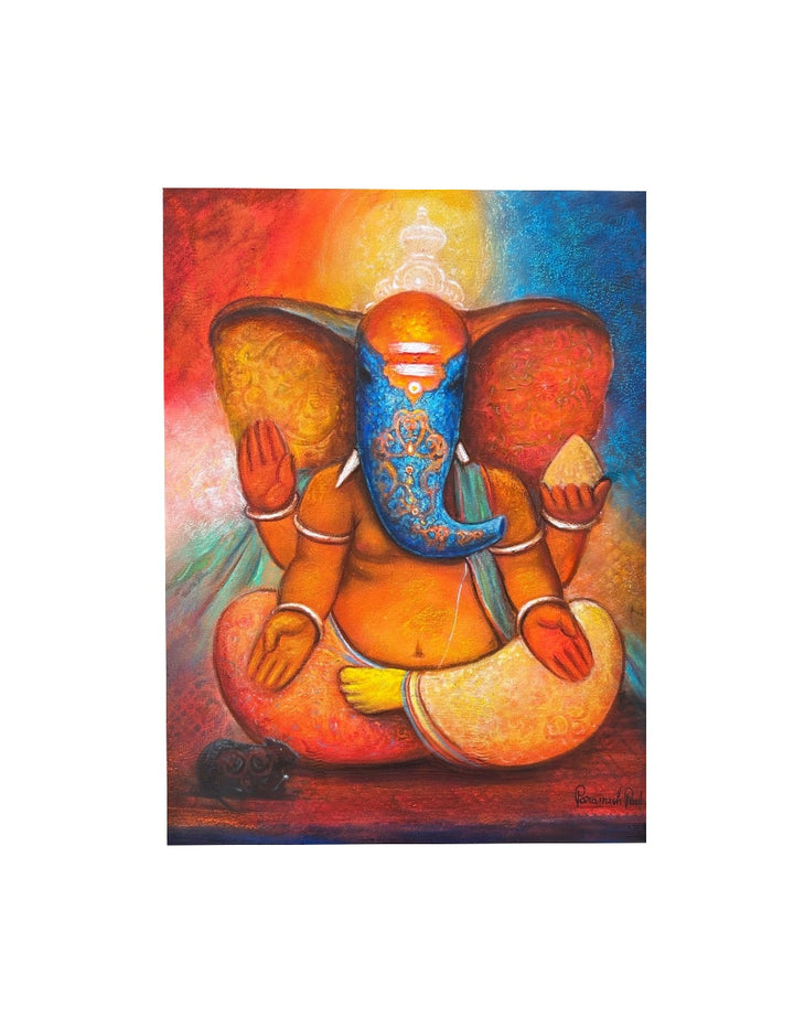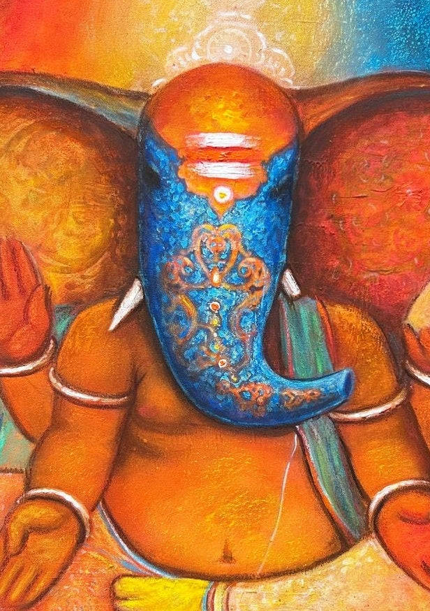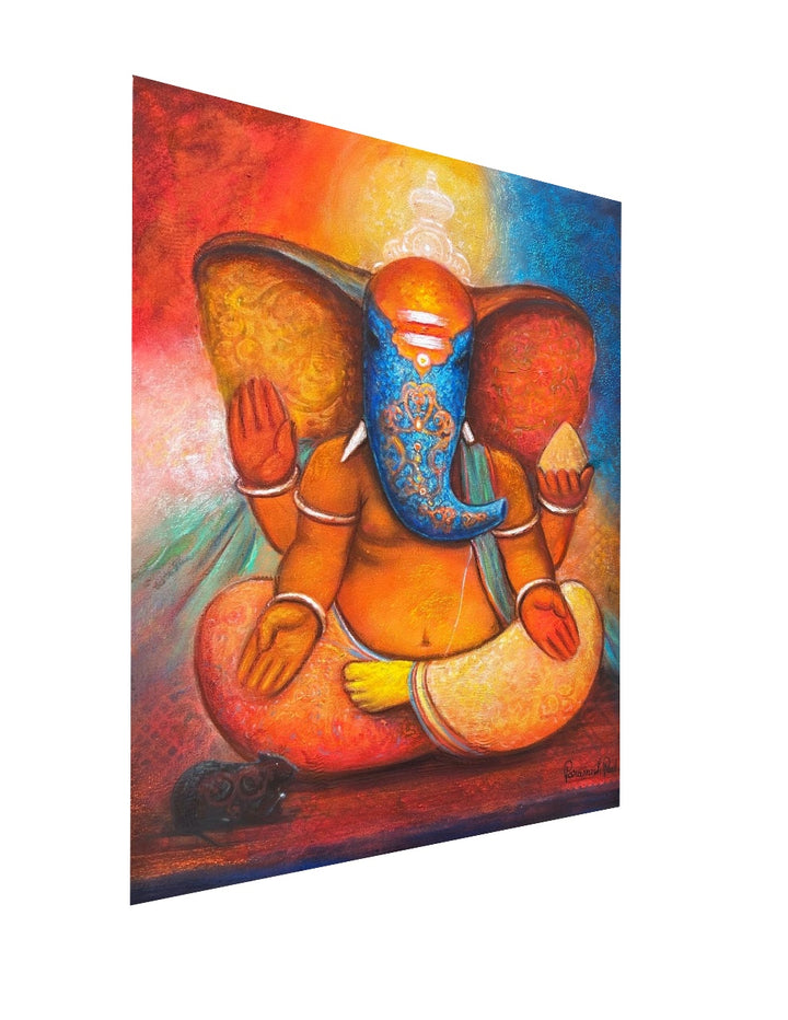 “Sacred Silence” captures Lord Ganesha in a deeply meditative state, embodying tranquility and spiritual stillness. The vibrant orange and golden hues around his form symbolize the inner fire of devotion, while the blue on his face and background represents infinite calm. His serene posture and symmetrical hand gestures evoke the energy of stillness—a silence that speaks volumes. The mouse at his side sits respectfully in quietude, reinforcing the sacredness of silence in spiritual practice.
