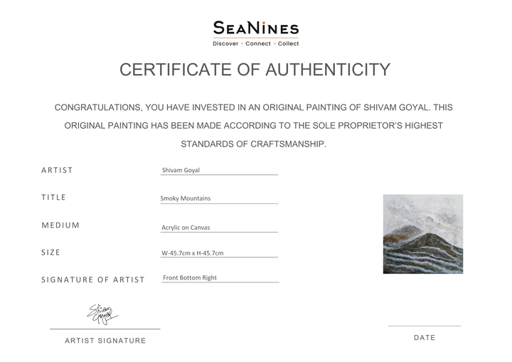 The painting "Smokey Mountains" captures the majestic beauty of a mountain range shrouded in mist, with undulating hills and peaks rising into the clouds. The artist's use of muted colors and textured brushstrokes evokes a sense of mystery and tranquility, inviting the viewer to step into the serene world of the Smokey Mountains.