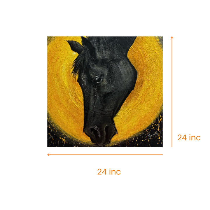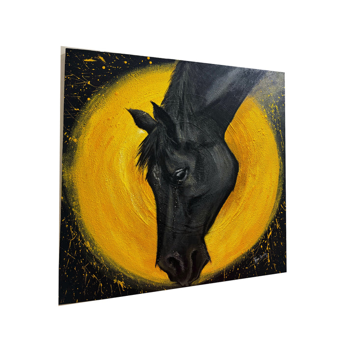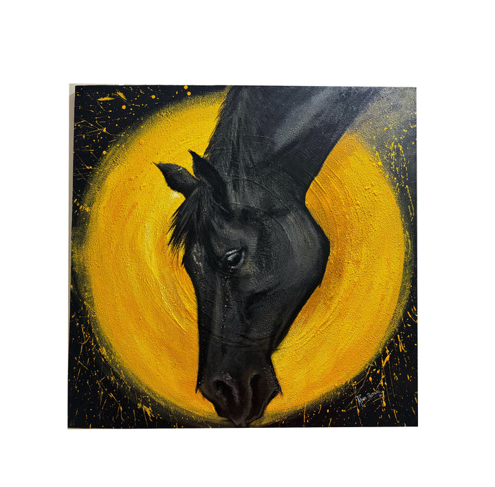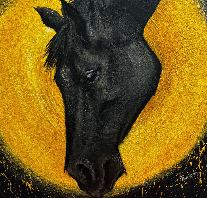 The painting "Sunlit Serenity" with a black horse calmly gazing into the ground beneath a bright. big yellow sun in the background con symbiose the theme of introspection and inner peace. The horse's calm expression suggests a sense of tranquility and acceptance, while the sun represents illumination and enlightenment. Together, they convey the idea of finding serenity and clarity within oneself. even amidst the brightness and challenges of life. The horse's downward gaze could signify a moment of reflection, inviting viewers to contemplate the beauty and stillness found in moments of quiet introspection.