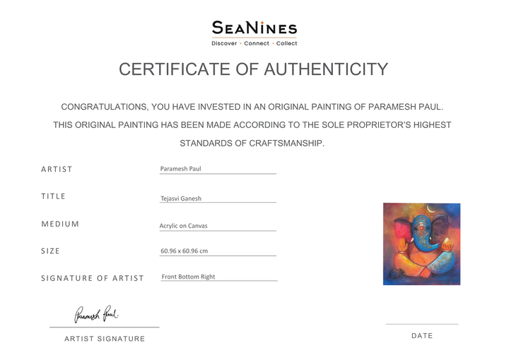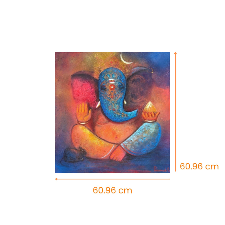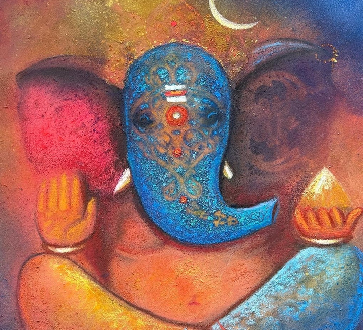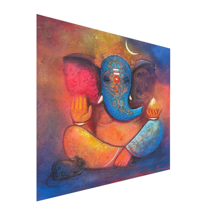 This radiant portrayal of Lord Ganesha glows with divine energy—“Tejasvi”, meaning radiant or full of brilliance. His face, adorned in striking blue with intricate patterns, emanates calm power and spiritual strength. The crescent moon above his crown symbolizes serenity and wisdom. With one hand raised in blessing and the other holding a modak, he radiates benevolence. The harmonious blend of deep reds, oranges, and blues conveys inner fire and peace, while the mouse at his feet quietly completes the cosmic balance.