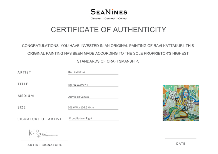 "Tigers & Women", portrays a central blue-toned woman regally seated alongside two serene tigers within an ornate and dreamlike setting. Her contemplative expression and the peaceful presence of the tigers suggest a harmonious coexistence and an exploration of inner strength and beauty. Through vibrant patterns and a surreal atmosphere, Ravi delves into the emotional connection between the woman and these powerful creatures, consistent with his artistic exploration of human feelings and feminine grace.