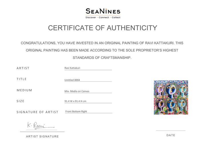 Ravi Kattakuri presents a composition of six stylized female faces, each rendered in varying shades of blue and purple, creating a sense of unity and individuality within the group. Surrounded by vibrant floral patterns and interspersed with birds, the women's large, expressive eyes invite contemplation of their inner emotional landscapes.